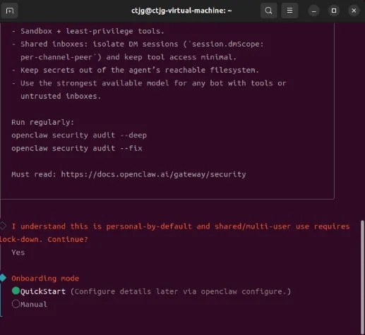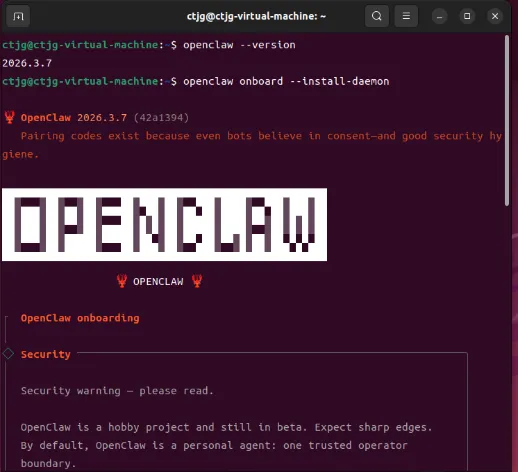 OpenClaw 提供 onboard 和 dashboard 两种路径,onboard 可通过 CLI 完成全部配置,适合技术用户,dashboard 通过可视化界面进行管理,更适合普通用户。图 5 中展示了使用虚拟机方案部署 openclaw 部分过程示例。