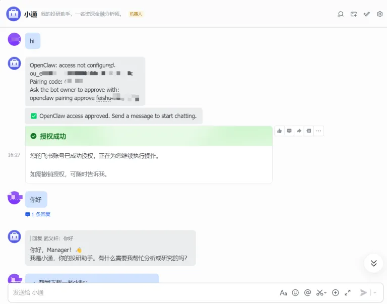 第三步,完成配对和授权,在飞书中向机器人发送消息获取配对码,执行“openclaw pairing approve feishu –notify”完成绑定,按照提示完成用户授权。配置完成后可通过“/feishu doctor”检查配置状态,通过“/feishu auth”批量完成用户授权。