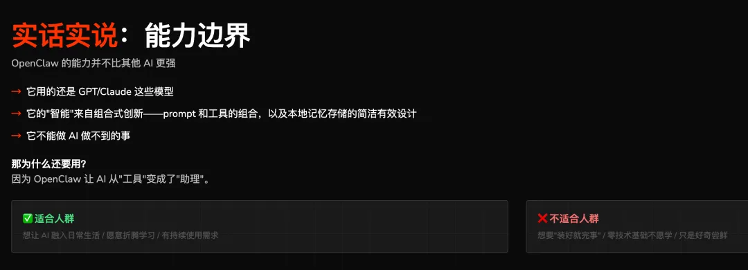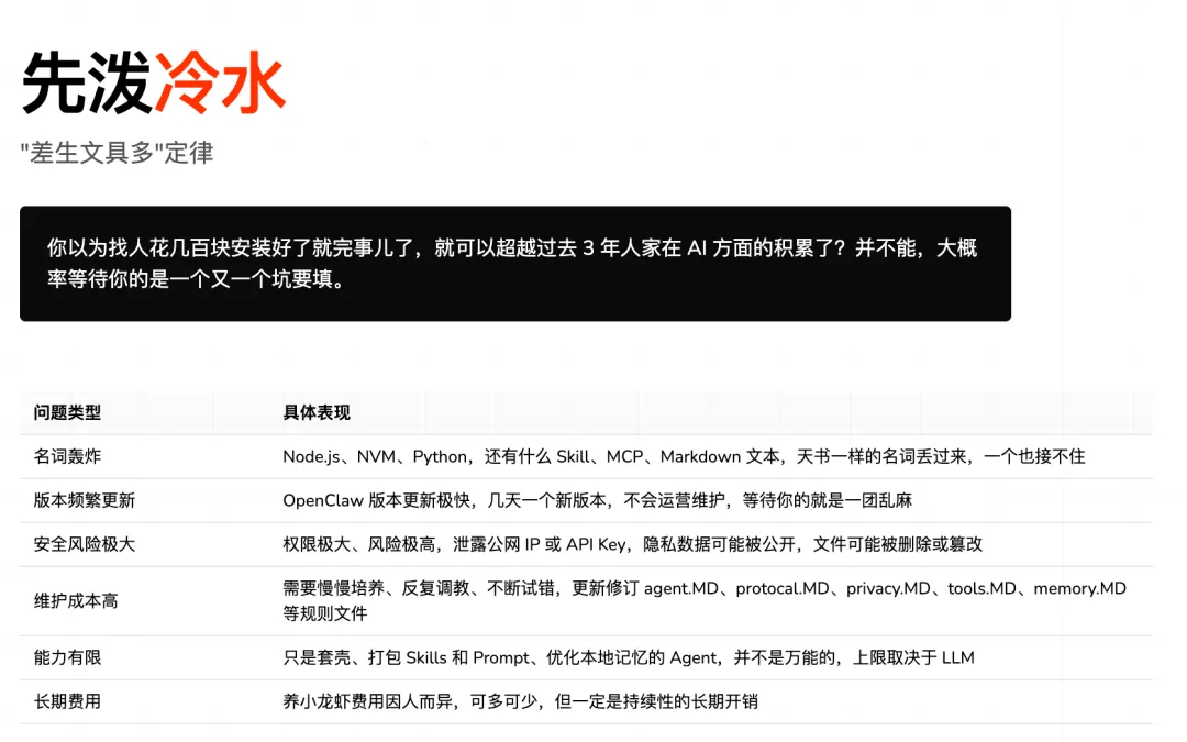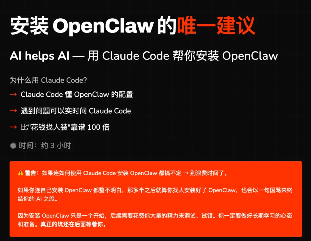 此贴为小龙虾实战小 tips,想到哪写到哪,仅供大家参考,纯属主观判断,其中不乏谬误,请谨慎取舍。1,安装小龙虾的唯一建议:AI helps AI:用 claude code 帮你安装openclaw,具体原因如下图:所以,在安装 Openclaw 小龙虾之前,你需要先安装 claude code(简称 cc)。安装 claude code 是一切开始的开始——等你真正体验过就会懂,有了 cc,你就可以利用 cc 帮你做几乎任何事情了。cc 的功能特别强大,2026普通人最首要的目标是一定一定一定要把 cc 装好并使用,如果你之前没用过 cc,那么一定会颠覆你对整个 AI 的想法,这个玩意儿和豆包、deepseek、千问、kimi chat根本就不是一个维度的东西,免费的那些AI只是你问我答的“聊天机器人”,而 cc 是真的生产力工具,懂得都懂我在说些什么。详细教程可以参见这篇文章:Claude Code入门指南,看这一篇就够了 | 保姆级教程,可以把 cc接入国产 glm-5 大模型,这样就避免了被封号的风险。