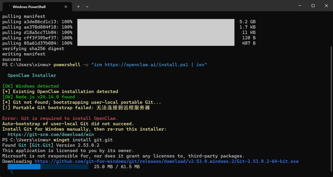 安装git,输入指令:winget install git.git,等待安装完成