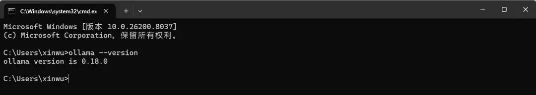 验证安装: 按 Win+R,输入cmd打开命令提示符输入: ollama --version出现版本号(如 ollama version 0.1.48)即成功