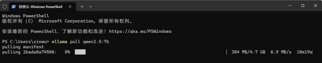 打开管理员命令提示符(Win+X → 终端 (管理员)) 复制以下命令,粘贴后回车(下载轻量中文模型,8GB 内存可跑): ollama pull qwen2.5:7b