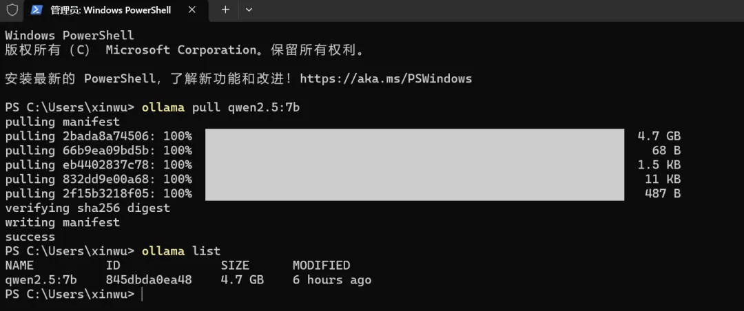 验证:输入 ollama list,能看到qwen2.5:7b即成功