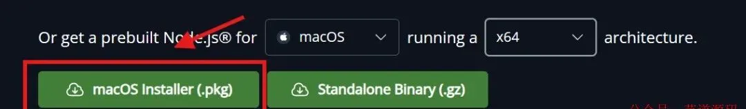 安装nodejs :官方安装包安装是最简单直接de的方式。打开 nodejs 官网:https://nodejs.org/en/download/,点击页面中 macOS 对应的 .pkg 安装包。推荐选 “LTS 稳定版”,适合大多数场景。