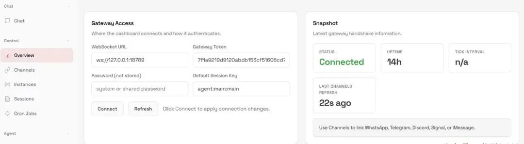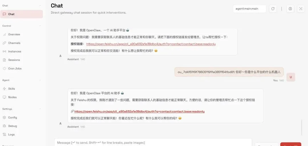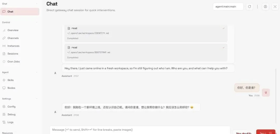 http://127.0.0.1:18789/?token=your-token进入页面之后,尝试给模型发一条消息,如果有回复就说明是成功了:
