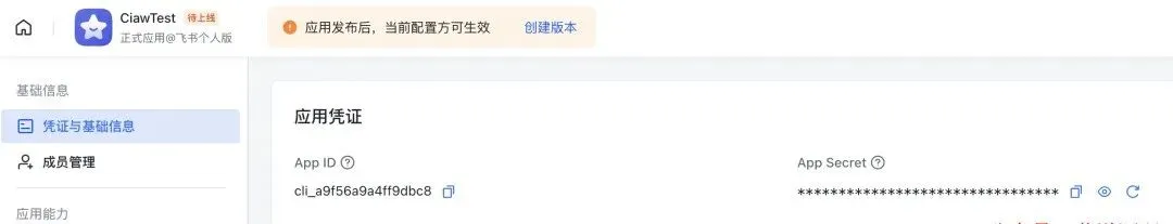 最后,进入 凭证与基础信息 查看自己的 App ID 、App Secret ,这些信息将会在后面飞书插件配置环节使用到。