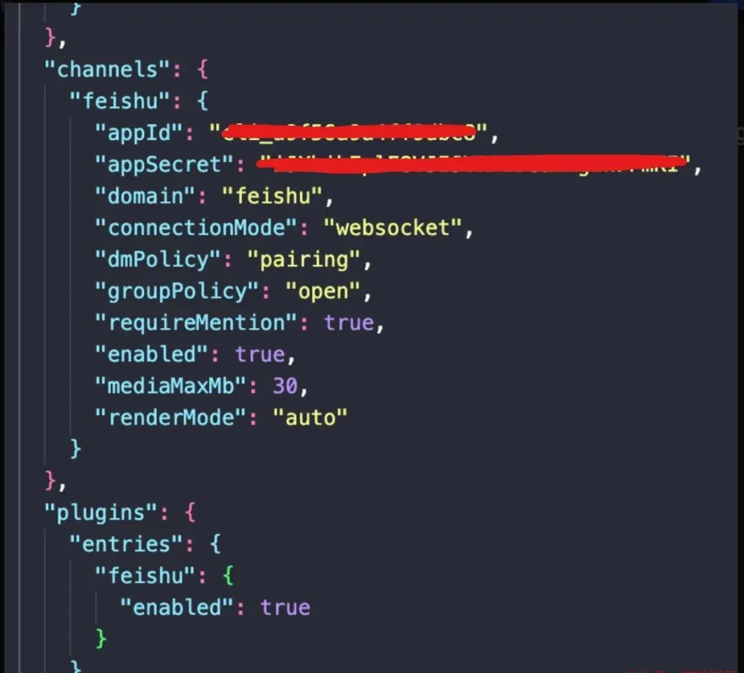 "channels": {"feishu": {"appId": "your-appId","appSecret": "your-appSecret","domain": "feishu","connectionMode": "websocket","dmPolicy": "pairing","groupPolicy": "open","requireMention": true,"enabled": true,"mediaMaxMb": 30,"renderMode": "auto" }},保存后 重启gateway ,让插件配置生效: