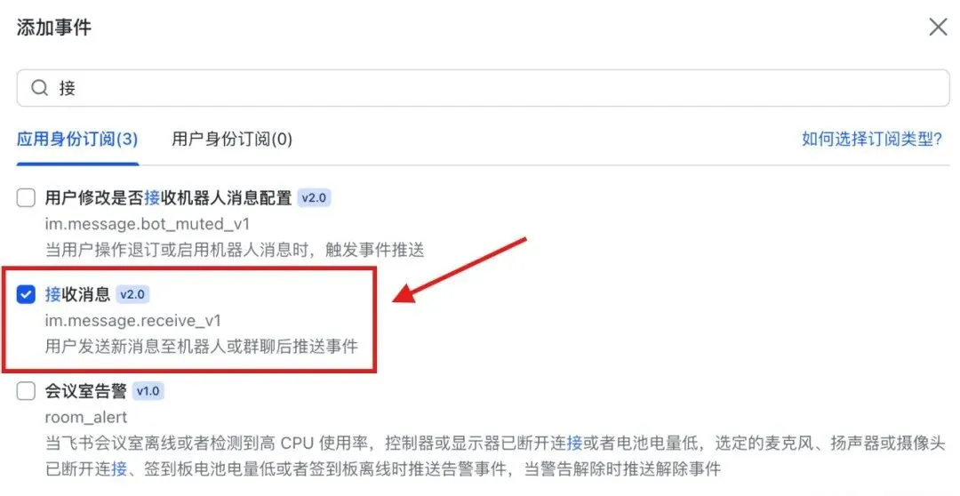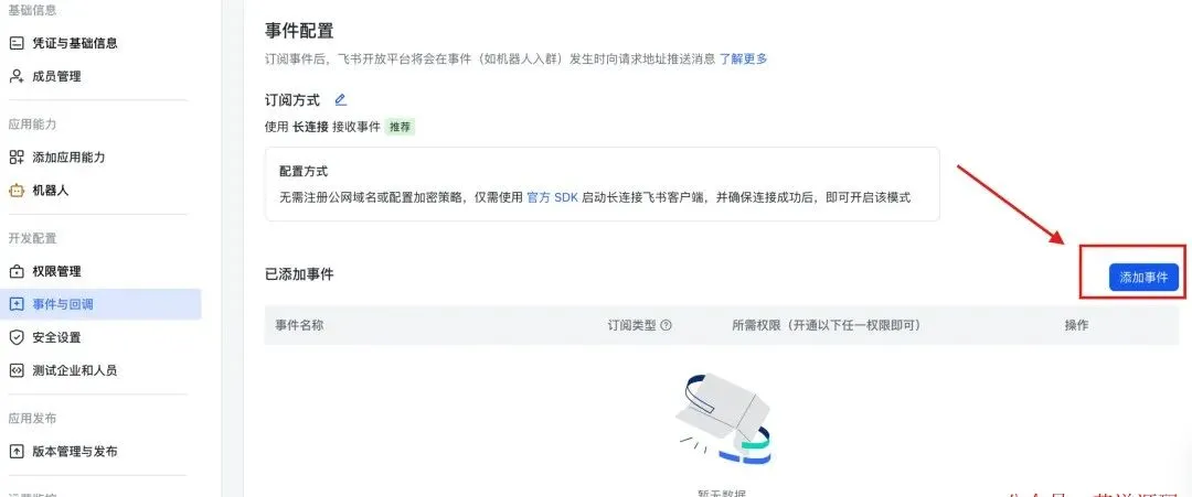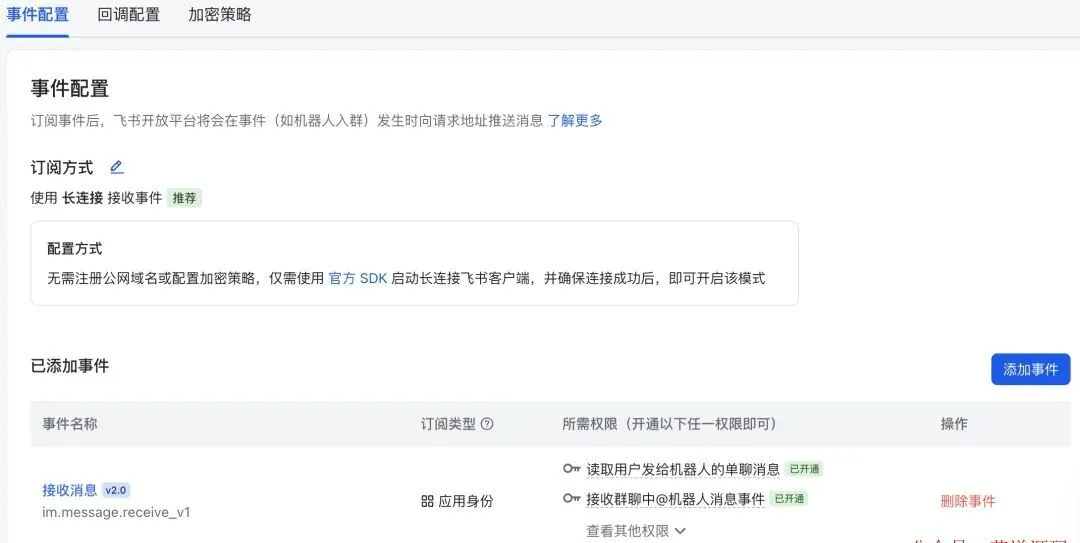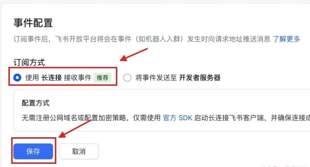 订阅方式选择 使用长连接 接收事件,然后保存: