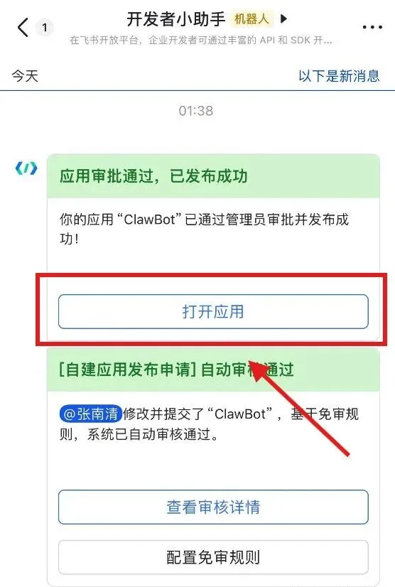 保存成功后,手机端的飞书会给你发一个消息。点击 打开应用 :