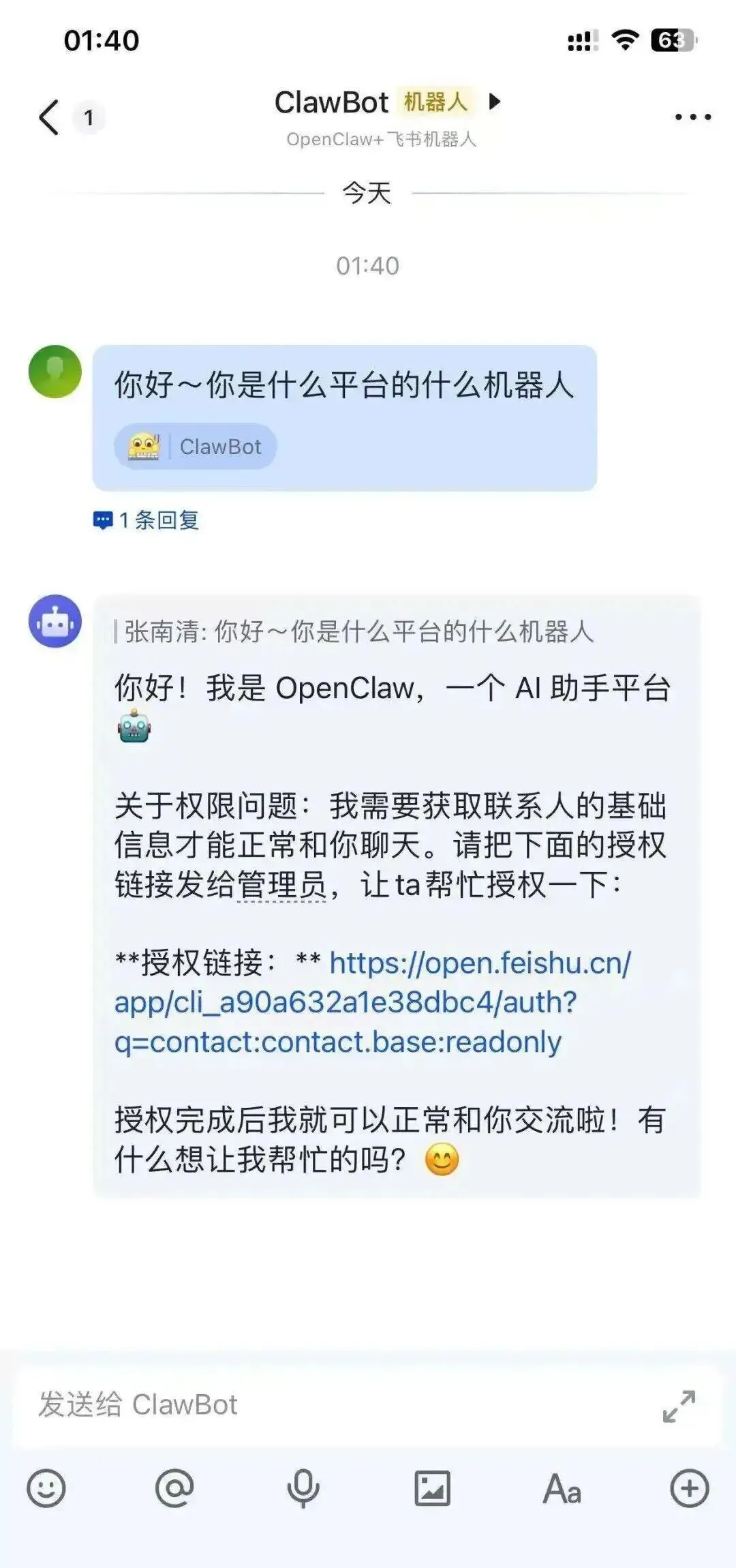 为什么要用飞书呢?首先用的是国内网络环境,其次在飞书群里 @机器人,可以直接指挥 OpenClaw 干活;同时不需要开着电脑盯着终端,手机也能可以发指令。