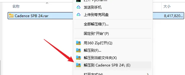 1.解压安装包:鼠标右击【Cadence SPB 24】压缩包,选择电脑上安装的解压软件,点击【解压到Cadence SPB 24】。