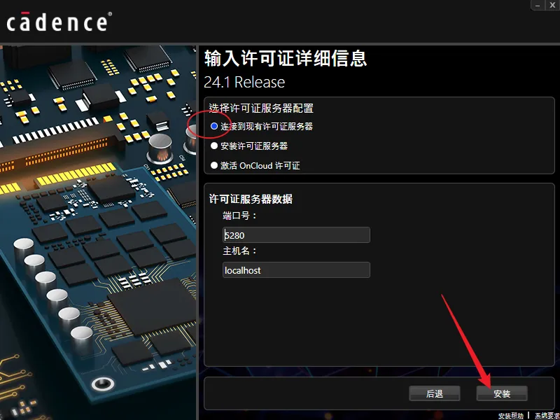 7.选择【连接到现有许可证...】,点击【安装】。