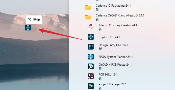 14.创建桌面快捷方式:①点击桌面任务栏中的【开始图标】>点击【所有应用】>双击展开【Cadence OrCAD X and...】文件夹②将【Capture CIS 24.1】图标拖到电脑桌面。
