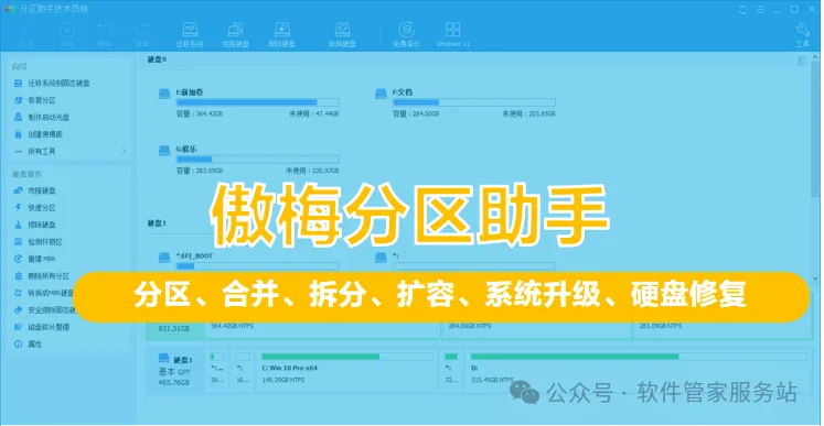 | 傲梅分区助手,可将硬盘进行分区、拆分、合并、硬盘检测与修复、系统升级等功能集合在一起,在可视化界面下即可完成相关操作,直观简洁。本平台所提供的文件均为压缩文件,如果电脑上没有此软件,可提前下载安装。 | |
