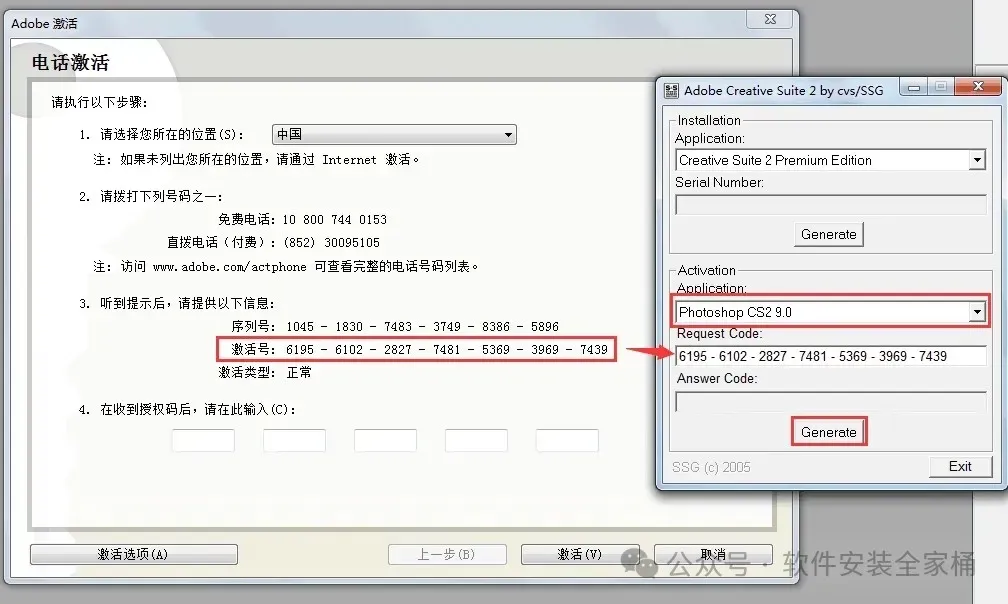 17.Application选择CS2 9.0。将激活号复制到Request后,点击“Generate”