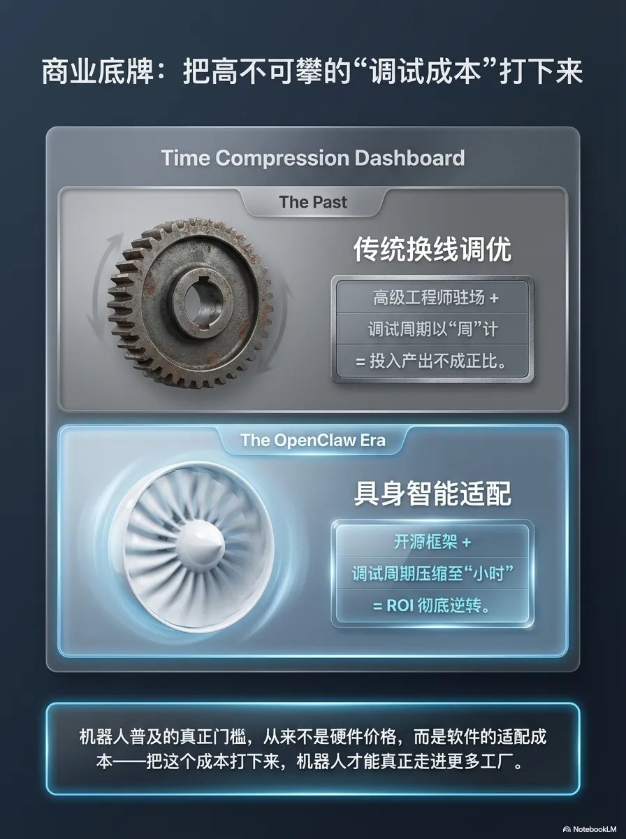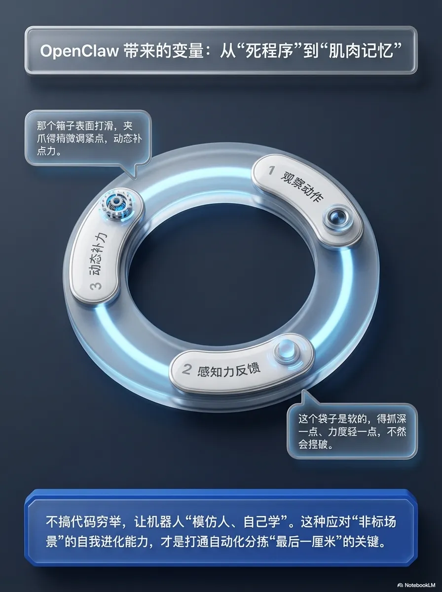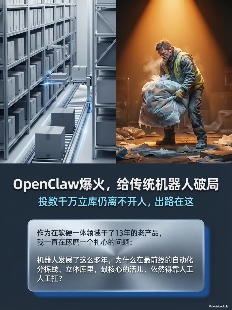 现在 AI 大模型满天飞,很多人都在追“算法焦虑”,觉得懂几句技术名词、会调几个模型,就是掌握了核心竞争力。但现实经验告诉我:AI 时代,真正的护城河,不是你懂多少算法公式,而是你能不能把 OpenClaw 这种“大脑”,稳稳当当地接在工厂的“躯干”上。未来的赢家,从来不是那些“纸上谈兵”的技术派,而是能解决实际问题的人——能让机器人真正处理掉那“歪掉的2厘米”,能帮企业把几千万的自动化投入,真正转化为利润的人。不聊虚的技术名词,不搞空洞的概念炒作,只聊 AI 机器人如何落地变现、如何帮企业降本增效。如果你也在关注具身智能的商业机会,也在头疼自动化落地的难题,欢迎关注我,咱们一起交流、一起落地。