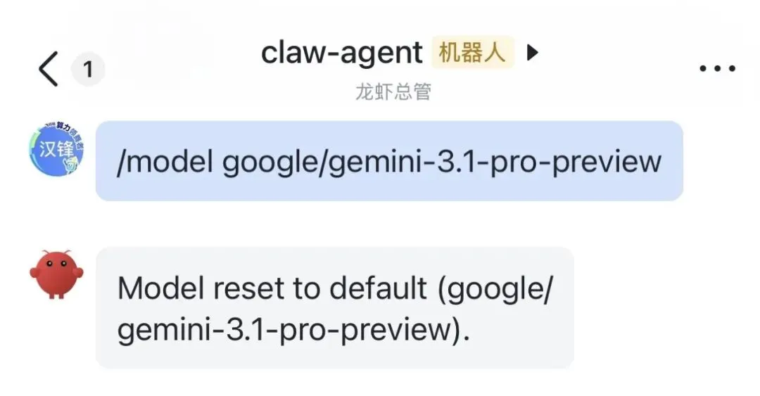 直接在聊天对话框中发送/model google/gemini-3.1-pro-preview命令,大模型就切换了。