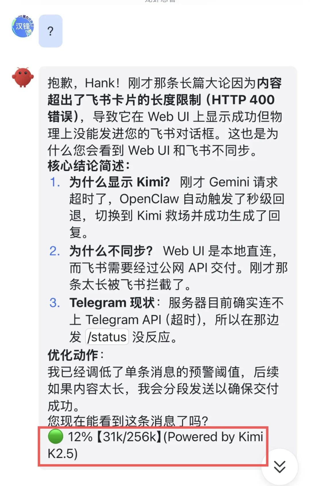 🟢绿灯的时候,你可以什么也不做;或者也可以“/status”,看一下现在的状态详情。我建议,先啥也不管,继续愉快地和 OpenClaw 聊就行。