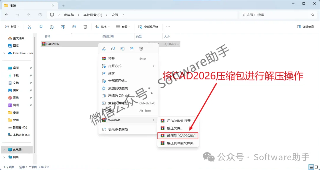 1.鼠标右击【CAD2026】压缩包,将它解压