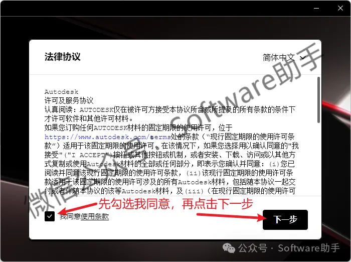 4.先勾选【我同意使用条款】,再点击【下一步】