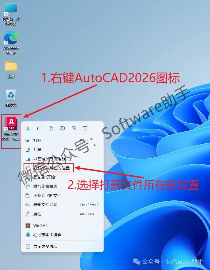 12.鼠标右键桌面上的【AutoCAD2026】,选择【打开文件所在的位置】