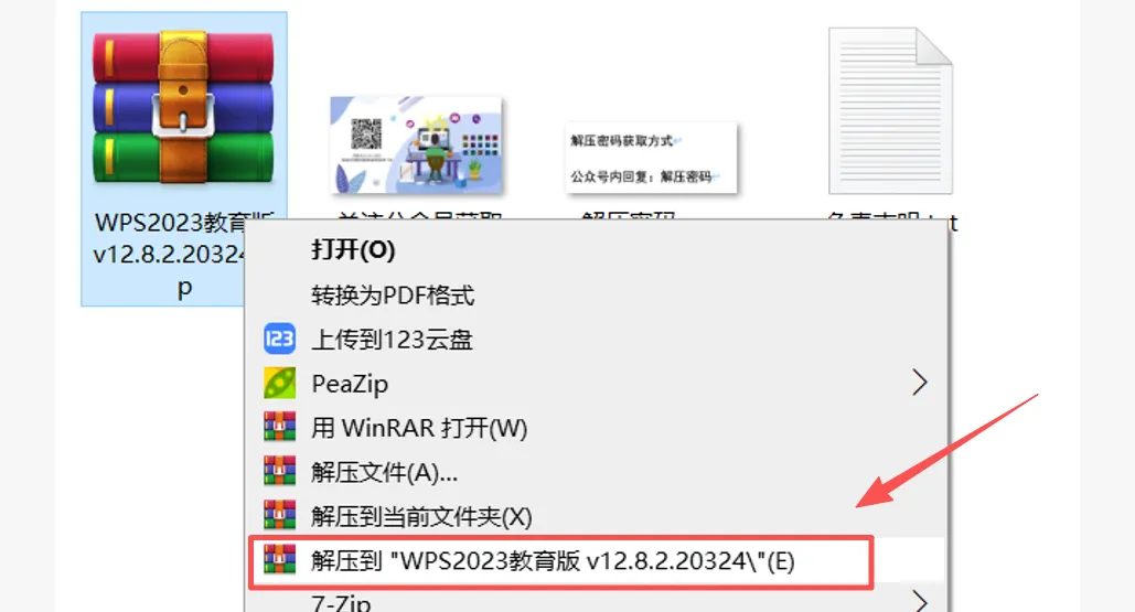 1.将提供资源下载好后,找到压缩包,鼠标右键【解压到 W--P--S2023教育版 v12.8.2.20324\】。