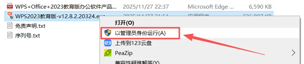 2.打开刚刚解压好的文件夹,找到【W-P--S2023教育版-v12.8.2.20324.exe】,鼠标右键选择【以管理员身份运行】。