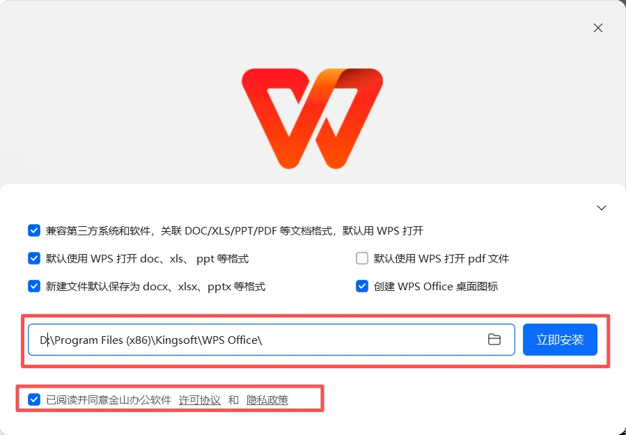 3,勾选【已阅读】,安装路径可以自己选择修改,建议只修改盘符,然后点击【立即安装】。