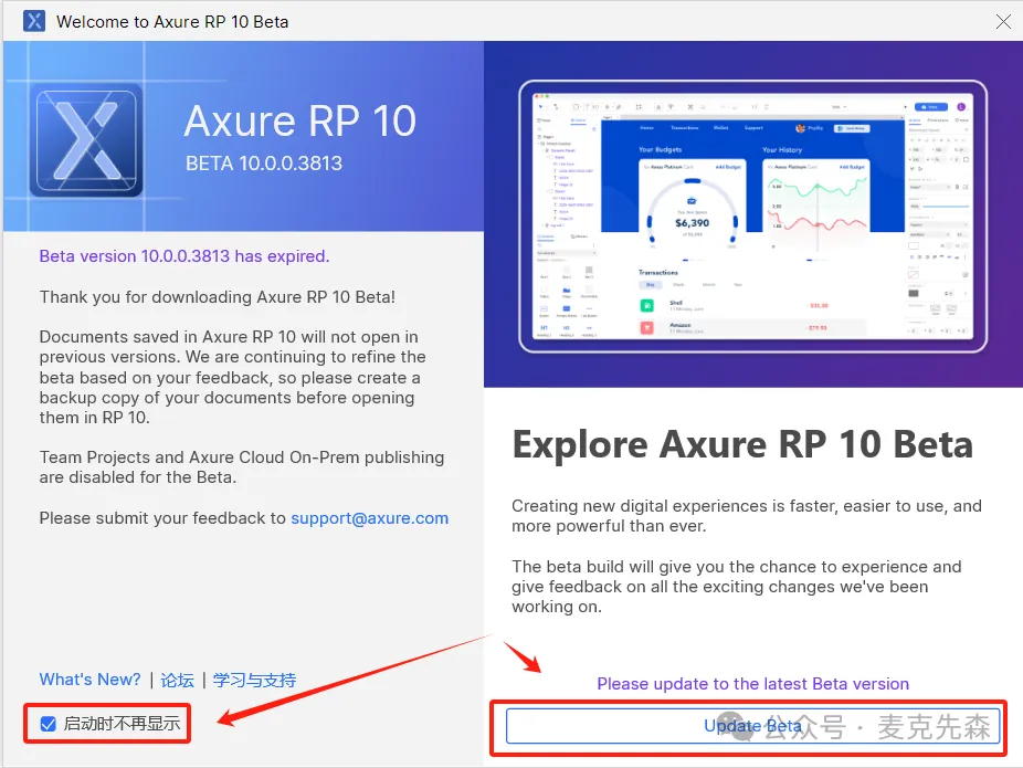 23,勾选【启动时不再显示】,再点击【Update Beta】。