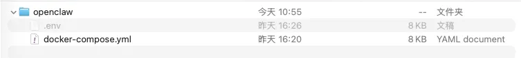 openclaw) 。我们需要将 docker-compose.yml 和 .env 这两个核心文件放入其中 。