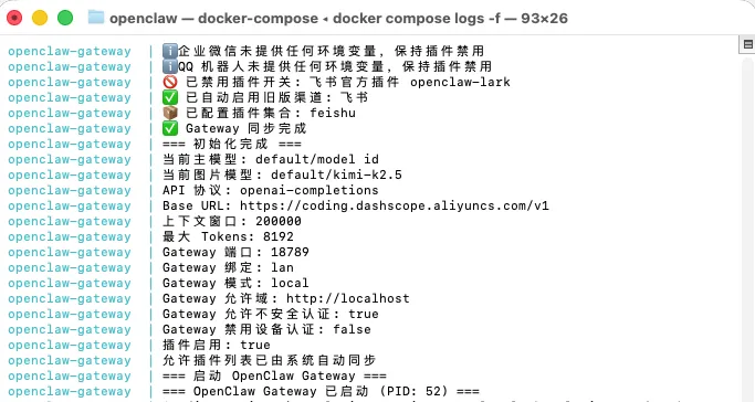 openclaw 目录下,执行这句拥有魔法的启动命令 :docker compose up -dCreated 提示,恭喜你,安装成功 !