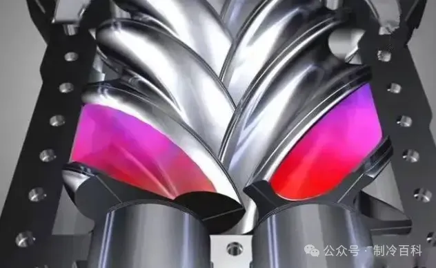 吸气过程:当主动螺杆旋转时,它会带动从动螺杆一起旋转。随着螺杆的旋转,齿槽容积逐渐扩大,并与吸入口相连通。此时,由蒸发系统来的气体通过孔口进入齿槽容积,完成气体的吸入过程。