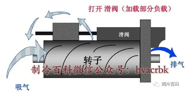通过滑阀的左右移动,增大或减小有效压缩容积,调节输气量大小。当加载时活塞左移带动滑阀左移,输气量增加;减载时:活塞右移带动滑阀右移,输气量减少。