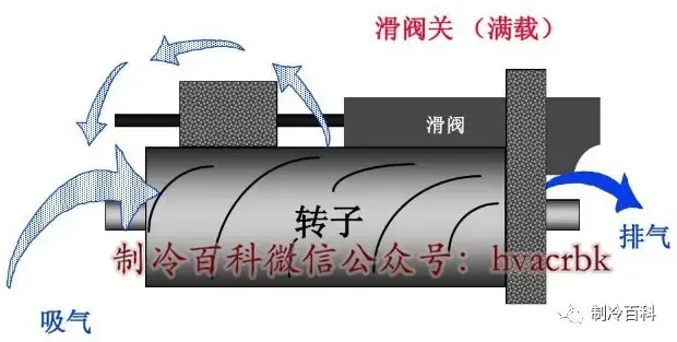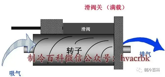 相反地,如果需要增加输出,则将滑阀向前推,使得更多的气体被压缩并通过排气口排出。下面3张图很好的诠释了滑阀从加载到满载的过程,注意看图中的活塞与滑阀的位置变化。