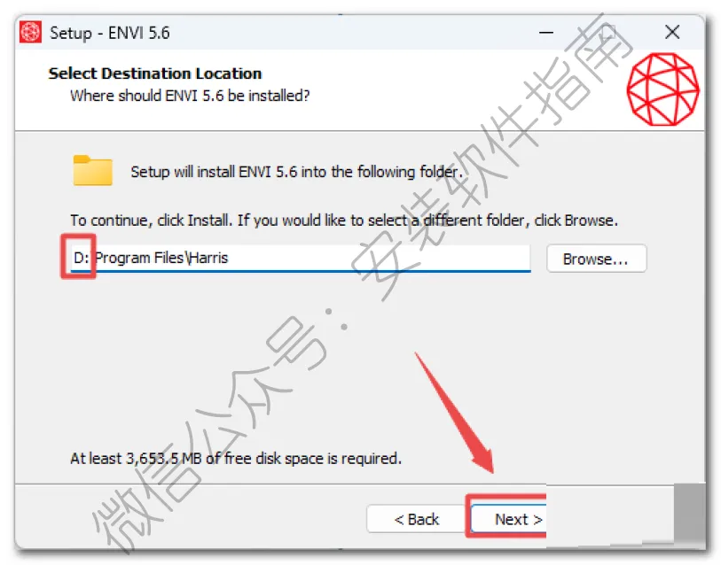 5、点击“Browse···”可以选择软件安装路径,建议和教程中的保持一致,本例安装到D盘(将路径地址中的首字符C改为D表示安装到D盘,或者可以在其它磁盘里创建一个新的文件夹,安装路径不要出现中文),点击“Next”