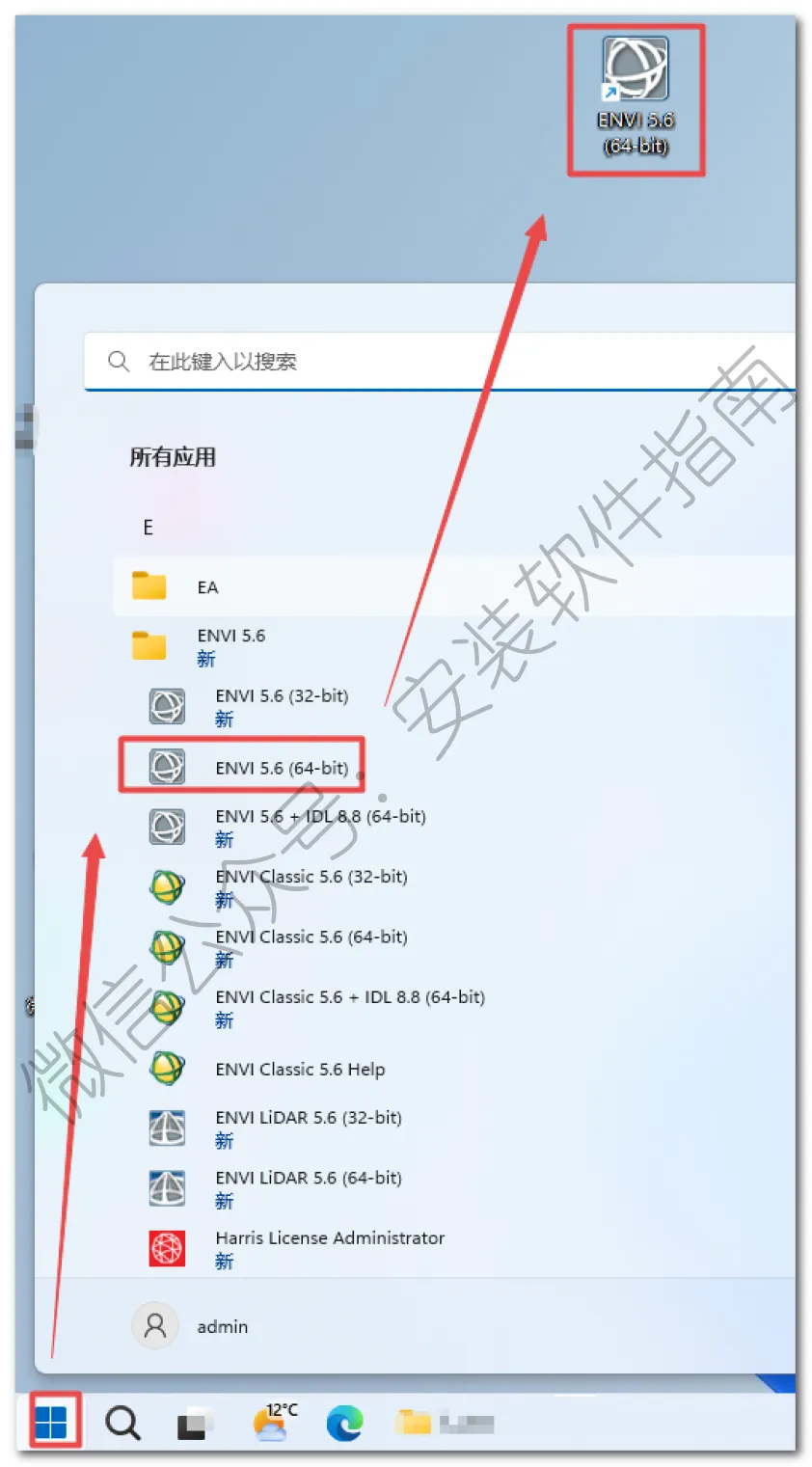 11、点击“开始“菜单栏,找到“ENVI 5.6 (64-bit)“软件(ENVI 5.6 32-bit操作方法一样),鼠标左键拖拽到桌面上即可创建桌面快捷方式
