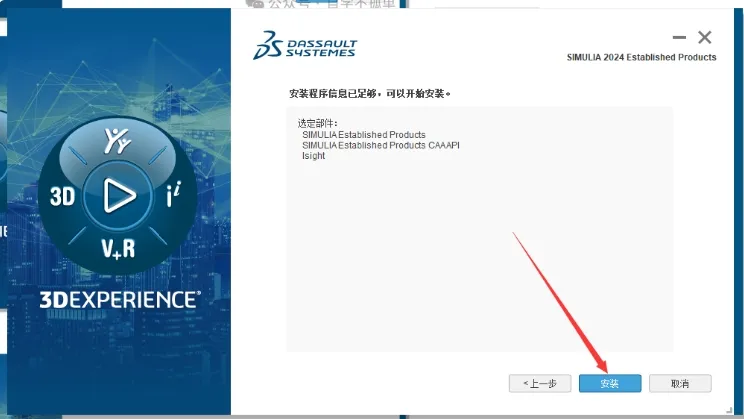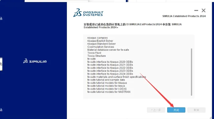 28. 安装程序已成功在您的计算机上的D:ISIMULIA\EstProducts12024中安装 SIMULLAEstablished Products 2024。点击【关闭】