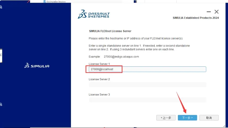 19. SIMULIA FLEXnet许可证服务器设置,输入:27800@localhost,然后点击【下一步】