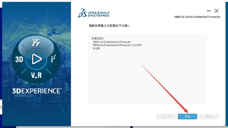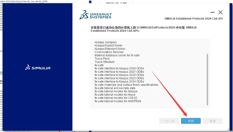 35. 安装程序已成功在您的计算机上的 D:ISIMULIAEstProducts12024中安装SIMULIAEstablished Products 2024 CAA APl。点击【关闭】