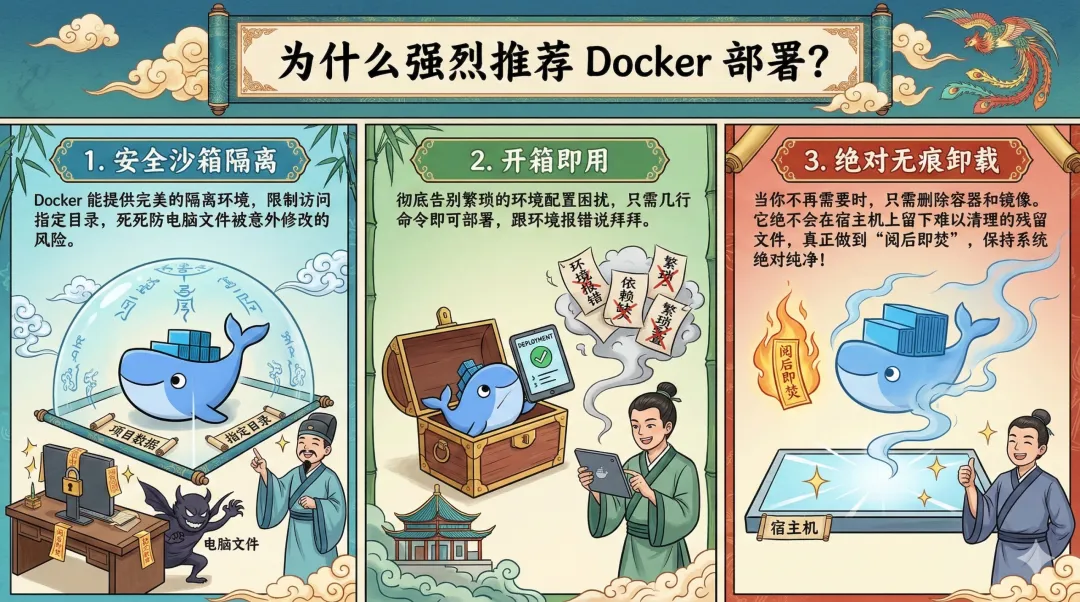 但通过 Docker 封装,我们不仅能实现一键启动,更能确保 AI 智能体始终运行在安全的隔离沙箱中,彻底解放你的双手和系统