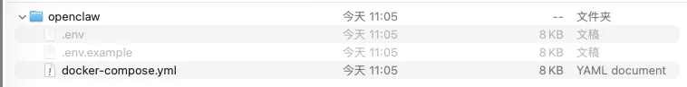 首先,在你的本地电脑新建一个文件夹(例如命名为 openclaw) 。我们需要将 docker-compose.yml 和 .env 这两个核心文件放入其中