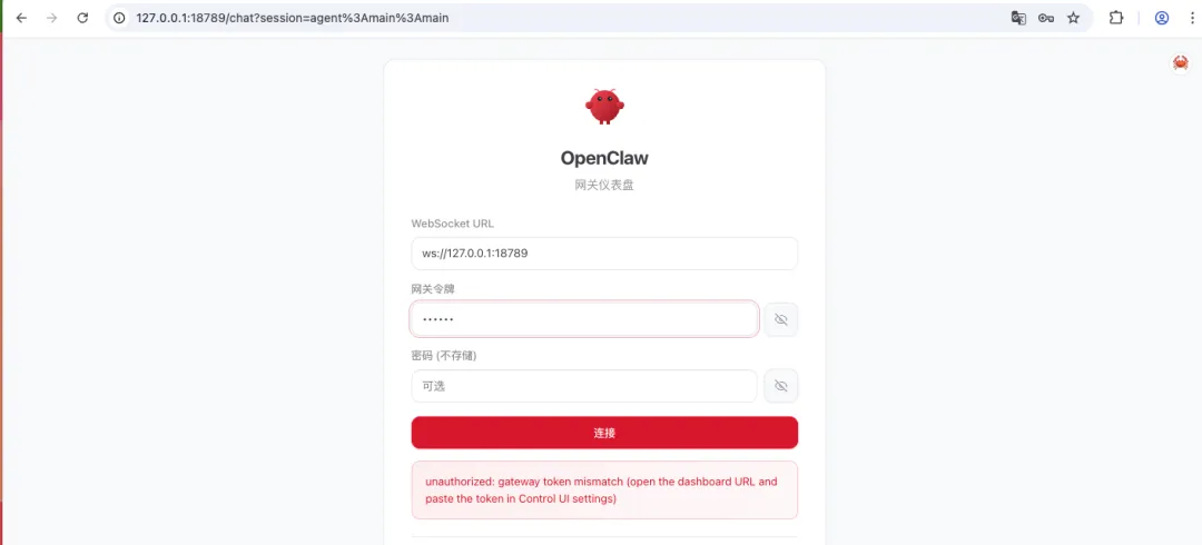 身份验证:在页面中的“网关令牌”处,输入您在 .env 文件里配置的 Token(如默认的 123456),即可顺利进入控制台