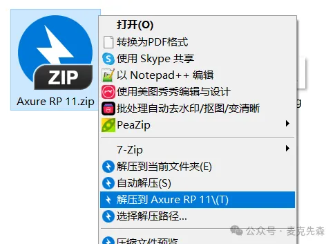 1.打开下载好的文件夹找到压缩包鼠标右键选择【解压到Axure RP 11\】。