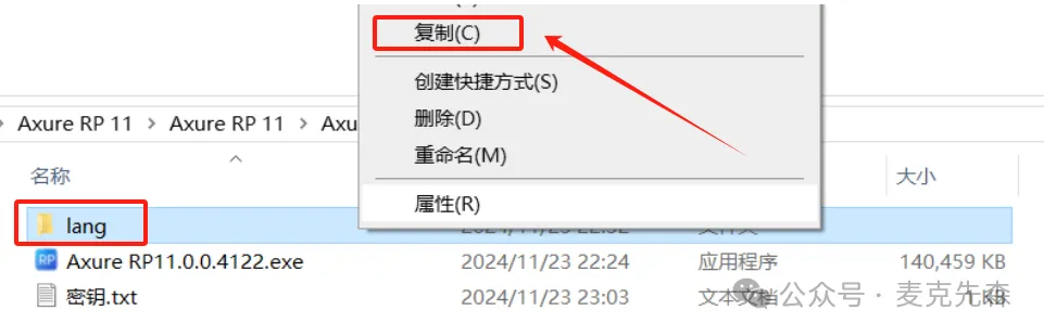 9,回到Axure RP 11文件夹,找到【lang】文件夹,再右键点击【复制按钮】。