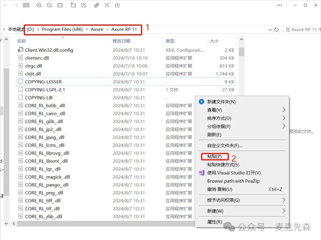 10,打开软件安装路径:D:\Program Files (x86)\ Axure\ Axure RP 11,步骤6可查看,再右键文件夹的空白处,点击【粘贴按钮】。