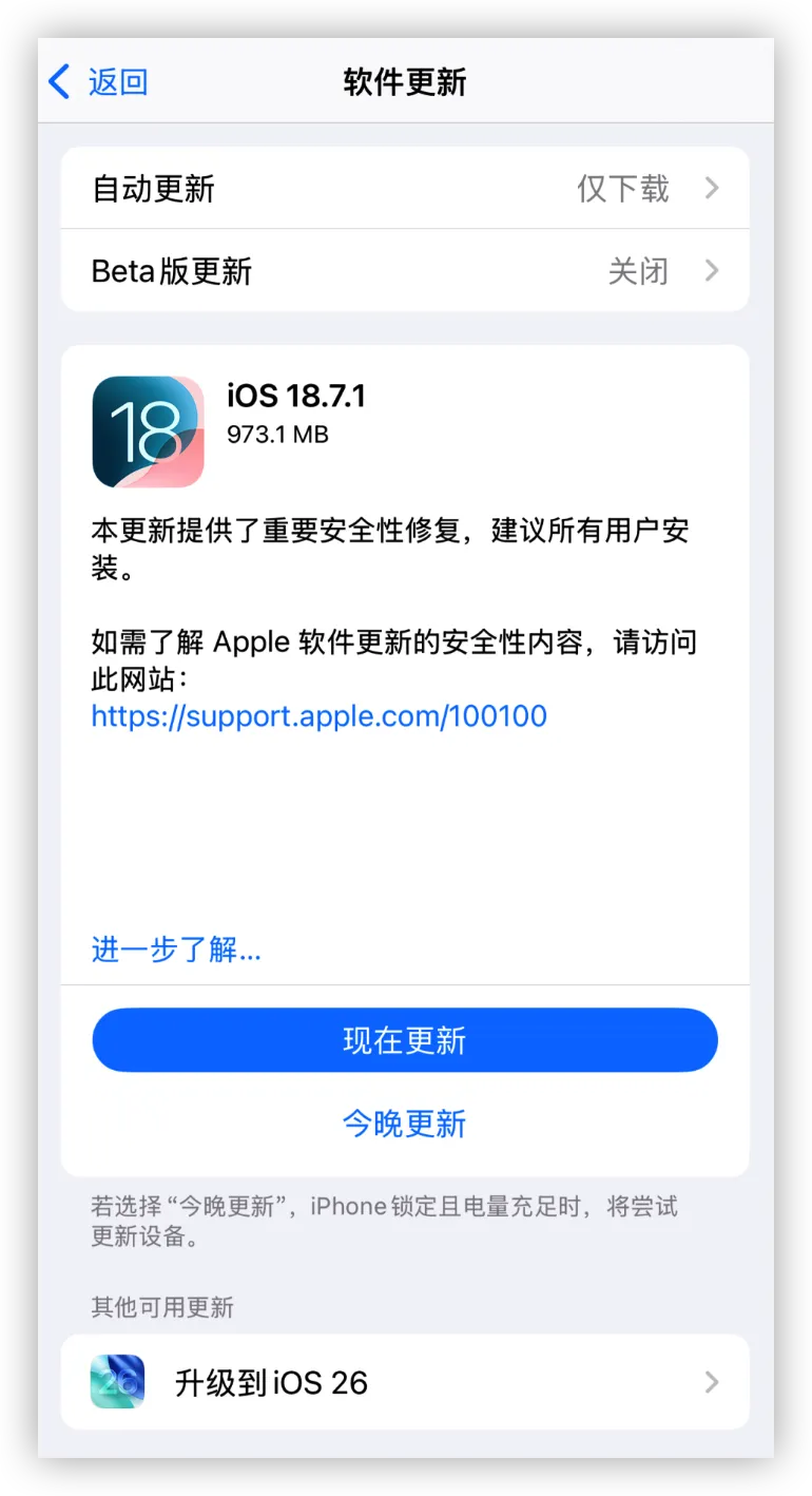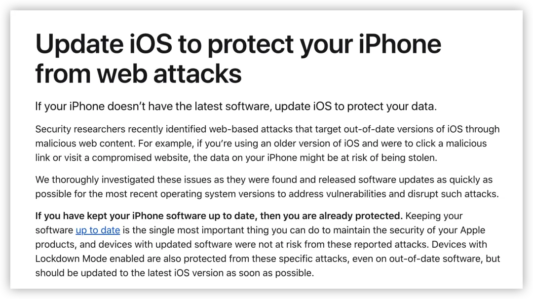 苹果警告,尽快升级 iOS 26!即便前几年允许用户停在旧版系统,并陆续推出常规安全更新。但通常在过一段时间后,苹果也会督促用户尽快升级至最新版本系统。尤其是对一些旧版 iPhone 来说,升级至新系统后,设备通常会面临更高的负载。具体表现上,也是以「卡顿」、「发热」和「耗电加剧」为主。不过与此前的「建议」不同,这次苹果直接发布了「警告」通知。在一份最新的官方支持文档中,苹果公布了一个十分严重的系统漏洞。新漏洞基于旧版 iOS 系统的 WebKit 架构存在,并已被黑客积极利用,衍生出两套工具包。分别是 DarkSword(主要针对 iOS 18)以及 Coruna(主要影响 iOS 13 至 iOS 17)。本质上,DarkSword 和 Coruna 都是高度复杂的「全链条」攻击武器。通过对多个系统漏洞的整合利用,实施从浏览器到系统底层代码的突破。可在用户访问网页时,获取 iPhone 的最高权限。可被窃取的信息范围包括:短信、联系人、浏览记录、备忘录、邮件、照片、通话记录、iCloud 数据等。