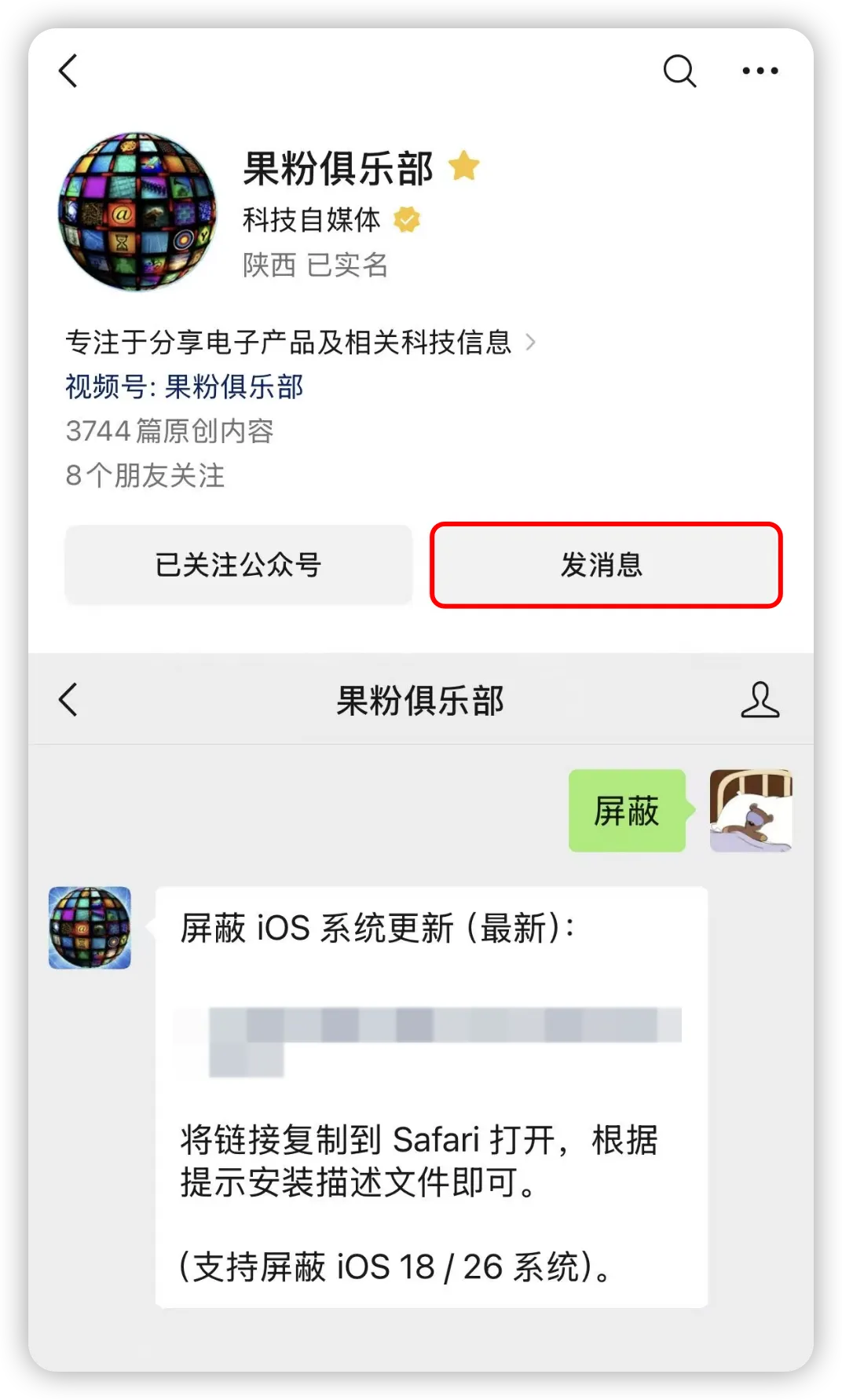 对于还在用 iOS 13 或 iOS 14 的用户,也建议尽快升级至 iOS 15。而想停留在当前系统「养老」的用户,也可以通过屏蔽更新描述文件,消灭深恶痛绝的小红点。感兴趣的小伙伴,可以进入果粉俱乐部公众号,点击右侧下方的「发消息」,回复关键词「屏蔽」获取描述文件下载链接。将链接复制至 Safari 浏览器打开后,按照提示下载描述文件。随后进入 iPhone「设置」,点击「已下载描述文件」。