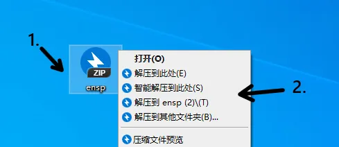 1.点击ensp压缩包,2.右键解压