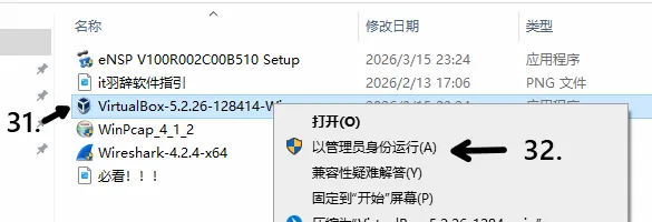 31.点击安装VirtualBox,32.右键以管理员身份运行