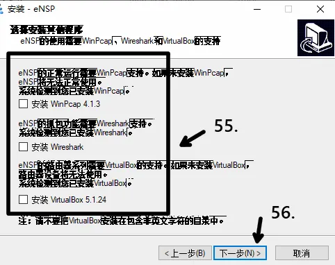 55.若未安装对应的配套软件环境,则勾选安装,56.点击下一步